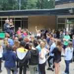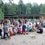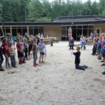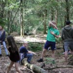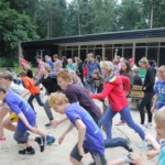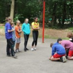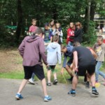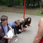 Beim ersten Spiel mussten M&Ms mit dem Mund gefangen werden, in der nächsten Runde wurde dann eine Partie Fliegenklatschenhockey gespielt, dann ging es in mittlerweile 8er Teams weiter zum Leitergolf. Auch hier gab es natürlich Sieger und Verlierer. Dann ging es weiter zu Prinzessin, Drache&Ritter (im Prinzip etwas ähnliches wie Schnick, Schnack, Schnuck und mit anderen Figuren und anschließendem Fangen). Dann blieben nur noch zwei Teams übrig und die mussten eine im Wald versteckte Fahne suchen und auch finden!