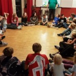 Als die Pizza dann endlich kam und die vielen hungrigen Mäuler gestopft waren, hieß es draußen Leiterschillerstrasse. Hier stellten die anwesenden Leiter einen typischen Leiterabend in der Ferienfreizeit nach und die Kinder durften einzelnen Darstellern versteckte Regieanweisungen geben und wurden mitunter auch in die Handlung einbezogen.